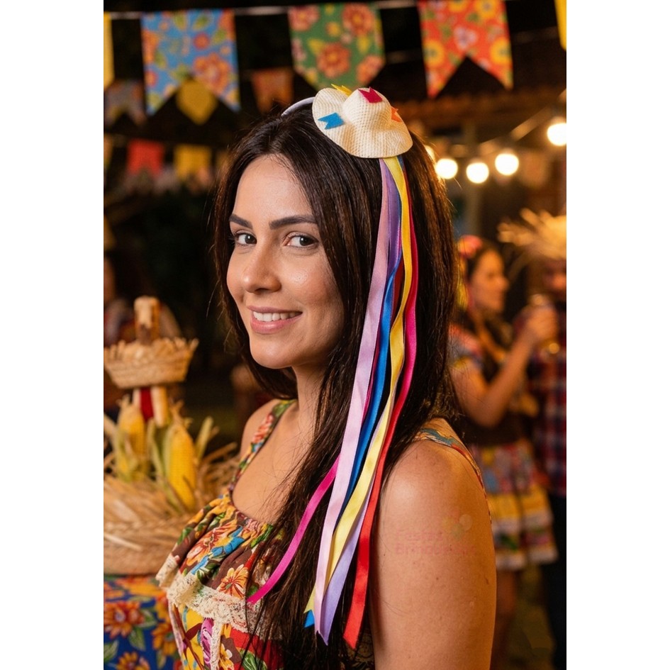 A tiara apresenta um delicado mini chapéu de palha de 8 cm, adornado com bandeirinhas coloridas em feltro e longas fitas de cetim que garantem movimento e alegria ao penteado. O arco possui excelente flexibilidade, adaptando-se confortavelmente tanto em adultos quanto em crianças.